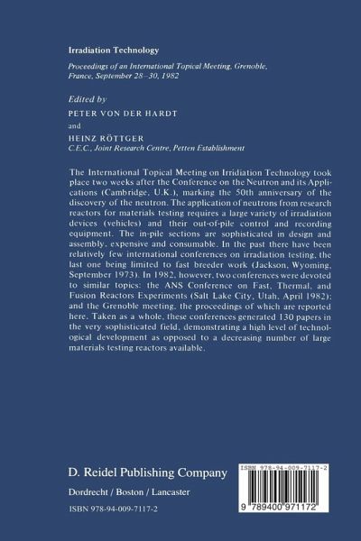 The International Topical Meeting on Irradiation Technology took place two the Neutron and its Applications (Cambridge, weeks after the Conference on th U. K.) marking the 50 anniversary of the discovery of the neutron. The application of neutrons from research reactors for materials testing requires a large variety of irradiation devices (vehicles) and their out-of-pile control and recording equipment. The in-pile sections are sophisticated in design and assem bly, expensive, and consumable. There have been only a few international con ferences on irradiation testing, the last one being…mehr
