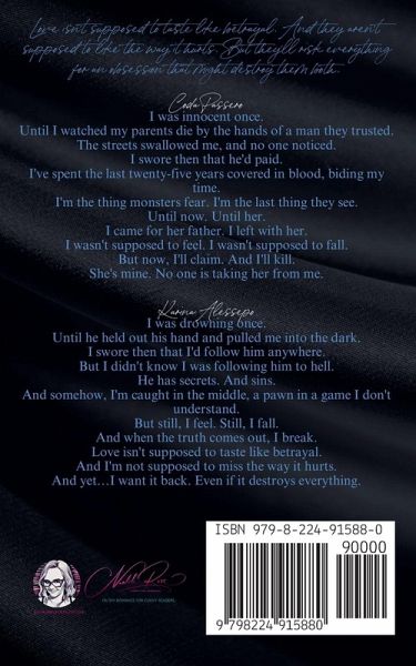 Love isn't supposed to taste like betrayal. And they aren't supposed to like the way it hurts. But they'll risk everything for an obsession that might destroy them both. Coda I was innocent once. Until I watched my parents die by the hands of a man they trusted. The streets swallowed me, and no one noticed. I swore then that he'd paid. I've spent the last twenty-five years covered in blood, biding my time. I'm the thing monsters fear. I'm the last thing they see. Until now. Until her. I came for her father. I left with her. I wasn't supposed to feel. I wasn't supposed to fall. But now, I'll claim. And I'll kill. She's mine. No one is taking her from me. Karina I was drowning once. Until he held out his hand and pulled me into the dark. I swore then that I'd follow him anywhere. But I didn't know I was following him to hell. He has secrets. And sins. And somehow, I'm caught in the middle, a pawn in a game I don't understand. But still, I feel. Still, I fall. And when the truth comes out, I break. Love isn't supposed to taste like betrayal. And I'm not supposed to miss the way it hurts. And yet...I want it back. Even if it destroys everything.
