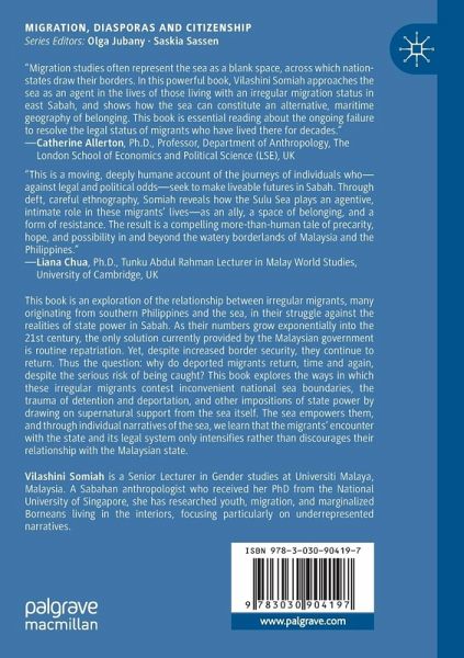 This book is an exploration of the relationship between irregular migrants, many originating from southern Philippines and the sea, in their struggle against the realities of state power in Sabah. As their numbers grow exponentially into the 21st century, the only solution currently provided by the Malaysian government is routine repatriation. Yet, despite increased border security, they continue to return. Thus the question: why do deported migrants return, time and again, despite the serious risk of being caught? This book explores the ways in which these irregular migrants contest inconvenient national sea boundaries, the trauma of detention and deportation, and other impositions of state power by drawing on supernatural support from the sea itself. The sea empowers them, and through individual narratives of the sea, we learn that the migrants' encounter with the state and its legal system only intensifies rather than discourages their relationship with the Malaysian state.