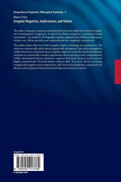 The author argues that two of the irregular negative meanings are implicatures. The others are semantically rather than pragmatically ambiguous. Since their ambiguity is neither lexical nor structural, direct irregular negatives satisfy the standard definition of idioms as syntactically complex expressions whose meaning is non-compositional. Unlike stereotypical idioms, idiomatic negatives lack fixed syntactic forms and are highly compositional. The final chapter analyzes other "free form" idioms, including irregular interrogatives and comparatives, self-restricted verb phrases, numerical verb phrases, and transparent propositional attitude and speech act reports.