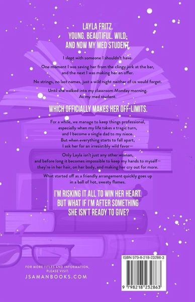 Layla Fritz. Young. Beautiful. Wild. And now my med student. I slept with someone I shouldn't have. One moment I was saving her from the clingy jerk at the bar, and the next I was making her an offer. No strings, no last names, just a wild night neither of us would forget. Until she walked into my classroom Monday morning. As my med student. Which officially makes her off-limits. For a while, we manage to keep things professional, especially when my life takes a tragic turn, and I become a single dad to my niece. But when everything starts to fall apart, I ask her for an irresistibly wild favor- Only Layla isn't just any other woman, and before long it becomes impossible to keep my hands to myself-they're in her hair, on her body, and making her cry out for more. What started off as a friendly arrangement quickly goes up in a ball of hot, sweaty flames. I'm risking it all to win her heart. But what if I'm after something she isn't ready to give?