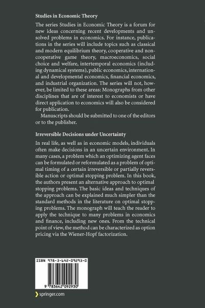 In real life, as well as in economic models, individuals often make decisions in an uncertain environment. In many cases, a problem which an optimizing agent faces can be formulated or reformulated as a problem of optimal timing of a certain irreversible or partially reversible action or optimal stopping problem. In this book, the authors present an alternative approach to optimal stopping problems. The basic ideas and techniques of the approach can be explained much simpler than the standard methods in the literature on optimal stopping problems. The monograph will teach the reader to apply the technique to many problems in economics and finance, including new ones. From the technical point of view, the method can be characterized as option pricing via the Wiener-Hopf factorization.