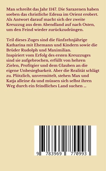 Man schreibt das Jahr 1147. Die Sarazenen haben soeben das christliche Edessa im Orient erobert. Als Antwort darauf macht sich der zweite Kreuzzug aus dem Abendland auf nach Osten, um den Feind wieder zu zurückzudrängen. Teil dieses Zuges sind die fünfzehnjährige Katharina mit Ehemann und Kindern sowie die Brüder Rudolph und Maximilian.Inspiriert vom Erfolg des ersten Kreuzzuges sind sie aufgebrochen, erfüllt von hehren Zielen, Profitgier und dem Glauben an die eigene Unbesiegbarkeit. Aber die Realität schlägt zu. Plötzlich, unvermittelt, stehen Max und Katja alleine da und müssen sich selbst ihren Weg durch ein feindliches Land suchen ...…mehr