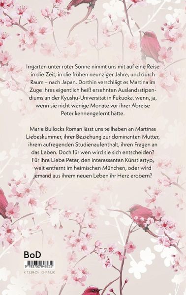 "Irrgarten unter roter Sonne" nimmt uns mit auf eine Reise in die Zeit, in die frühen neunziger Jahre, und durch Raum - nach Japan. Dorthin verschlägt es Martina im Zuge ihres eigentlich heiß ersehnten Auslandsstipendiums an der Kyushu-Universität in Fukuoka, wenn, ja, wenn sie nicht wenige Monate vor ihrer Abreise Peter kennengelernt hätte. Marie Bullocks Roman lässt uns teilhaben an Martinas Liebeskummer, ihrer Beziehung zur dominanten Mutter, ihrem aufregenden Studienaufenthalt, ihren Fragen an das Leben. Doch für wen wird sie sich entscheiden? Für ihre Liebe Peter, den interessanten Künstlertyp, weit entfernt im heimischen München, oder wird jemand aus ihrem neuen Leben ihr Herz erobern?