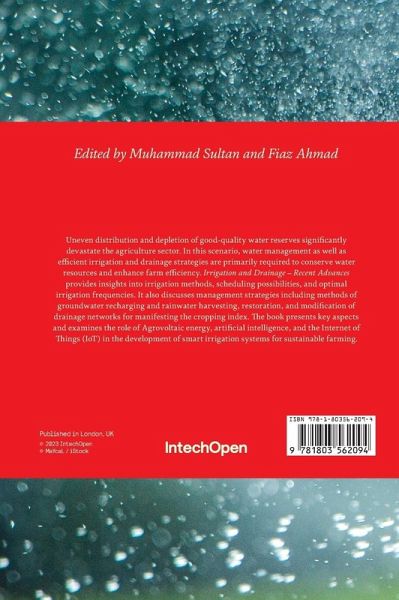 Uneven distribution and depletion of good-quality water reserves significantly devastate the agriculture sector. In this scenario, water management as well as efficient irrigation and drainage strategies are primarily required to conserve water resources and enhance farm efficiency. Irrigation and Drainage ¿ Recent Advances provides insights into irrigation methods, scheduling possibilities, and optimal irrigation frequencies. It also discusses management strategies including methods of groundwater recharging and rainwater harvesting, restoration, and modification of drainage networks for manifesting the cropping index. The book presents key aspects and examines the role of Agrovoltaic energy, artificial intelligence, and the Internet of Things (IoT) in the development of smart irrigation systems for sustainable farming.