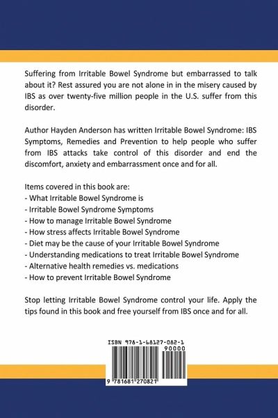 Suffering from Irritable Bowel Syndrome but embarrassed to talk about it? Rest assured you are not alone in in the misery caused by IBS as over twenty-five million people in the U.S. suffer from this disorder. Author Hayden Anderson has written "Irritable Bowel Syndrome: IBS Symptoms, Remedies and Prevention" to help people who suffer from IBS attacks take control of this disorder and end the discomfort, anxiety and embarrassment once and for all. Items covered in this book are: o What Irritable Bowel Syndrome is o Irritable Bowel Syndrome Symptoms o How to manage Irritable Bowel Syndrome o How stress affects Irritable Bowel Syndrome o Diet may be the cause of your Irritable Bowel Syndrome o Understanding medications to treat Irritable Bowel Syndrome o Alternative health remedies vs. medications o How to prevent Irritable Bowel Syndrome Stop letting Irritable Bowel Syndrome control your life. Apply the tips found in this book and free yourself from IBS once and for all.