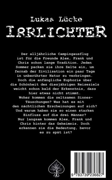 Der alljährliche Campingausflug ist für die Freunde Alex, Frank und Chris schon lange Tradition. Jeden Sommer packen sie ihre Zelte ein, um fernab der Zivilisation ein paar Tage in unberührter Natur zu verbringen. Doch die anfängliche Euphorie über die Schönheit des diesjährigen Reiseziels weicht schon bald der Erkenntnis, dass hier etwas nicht stimmt. Woher kommen die seltsamen Sinnestäuschungen? Was hat es mit den nächtlichen Erscheinungen auf sich? Und warum haben sie so einen starken Einfluss auf die drei Männer? Nur langsam kommen Alex, Frank und Chris hinter das Geheimnis. Doch erkennen sie die Bedeutung, bevor es zu spät ist?> Der gesamte Gewinn dieses Buches wird ausnahmslos an Pro Asyl gespendet. <