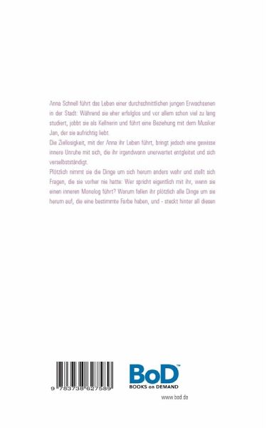 Anna Schnell führt das Leben einer durchschnittlichen jungen Erwachsenen in der Stadt: Während sie eher erfolglos und vor allem schon viel zu lang studiert, jobbt sie als Kellnerin und führt eine Beziehung mit dem Musiker Jan, der sie aufrichtig liebt.Die Ziellosigkeit, mit der Anna ihr Leben führt, bringt jedoch eine gewisse innere Unruhe mit sich, die ihr irgendwann unerwartet entgleitet und sich verselbstständigt.Plötzlich nimmt sie die Dinge um sich herum anders wahr und stellt sich Fragen, die sie vorher nie hatte: Wer spricht eigentlich mit ihr, wenn sie einen inneren Monolog führt? Warum fallen ihr plötzlich alle Dinge um sie herum auf, die eine bestimmte Farbe haben, und - steckt hinter all diesen neuen Auffälligkeiten vielleicht ein System?`Irrsinn´ ist die Erzählung aus der Sicht einer Frau, deren Realität sich plötzlich von der ihres Umfeldes unterscheidet - sie erkrankt an Schizophrenie.Unvermeidbar wird sie irgendwann für mehrere Wochen in die geschlossene Psychiatrie eingewiesen.Sie berichtet von diesem Aufenthalt mit seinen Regeln und Vorschriften ebenso wie vom Miteinander der Patienten. Dabei beschreibt sie skurrile, lustige, aber auch tief berührende Situationen, die plötzlich ihr - realer - Alltag sind.Mit einer gehörigen Portion Situationskomik und Selbstironie, aber auch tragischen Momentaufnahmen ist `Irrsinn´ ein Versuch, den Leser zu sensibilisieren für eine Welt neben der geliebten "Normalität", die für viele Menschen realer Alltag ist. Dabei ist der leise Unterton von Kritik am Umgang mit psychischer Krankheit in unserem Kulturkreis mal lauter, mal leiser zu hören.