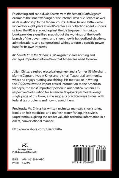 Fascinating and candid, IRS Secrets from the Nation's Cash Register examines the inner workings of the Internal Revenue Service as well as its relationship to the federal courts. Author Julian Chitta - who worked for eight years at an IRS center as a collection agent - shows us how the IRS is stacked against the US taxpayer. This unique book provides a qualified snapshot of the workings of the fourth branch of the government, and shows how it has outlived elections, administrations, and congressional whims to form a specific power base for its own interests. IRS Secrets from the Nation's Cash Register spares nothing and divulges important information that Americans need to know. About the Author: Julian Chitta, a retired electrical engineer and a former US Merchant Marine Captain, lives in Kingsland, a small Texas rural community, where he enjoys hunting and fishing. His motivation in writing the IRS Secrets was to impart critical information to the American taxpayer, the most important person in our political system. His respect and admiration for American taxpayers permeates every single page of this book, as he suggests practical ways to deal with federal tax problems and how to avoid them. Previously, Mr. Chitta has written technical manuals, short stories, books on folk medicine, and on fresh water fishing. His style is unpretentious, giving the reader valuable technical information in a direct, conversational manner. Publisher's website: http://www.sbpra.com/JulianChitta