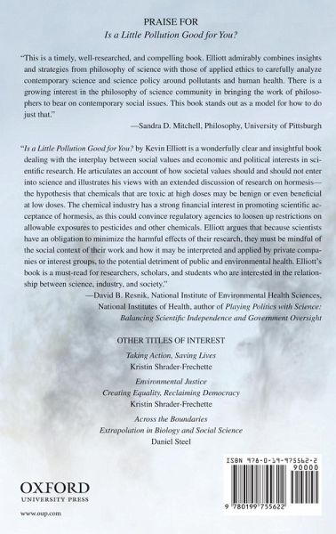 Could low-level exposure to polluting chemicals be analogous to exercise-a beneficial source of stress that strengthens the body? Some scientists studying the phenomenon of hormesis (beneficial or stimulatory effects caused by low-dose exposure to toxic substances) claim that that this may be the case. Is A Little Pollution Good For You? critically examines the current evidence for hormesis. In the process, it highlights the range of methodological and interpretive judgments involved in environmental research: choices about what questions to ask and how to study them, decisions about how to categorize and describe new information, judgments about how to interpret and evaluate ambiguous evidence, and questions about how to formulate public policy in response to debated scientific findings. The book also uncovers the ways that interest groups with deep pockets attempt to influence these scientific judgments for their benefit. Several chapters suggest ways to counter these influences and incorporate a broader array of societal values in environmental research: (1) moving beyond conflict-of-interest policies to develop new ways of safeguarding academic research from potential biases; (2) creating deliberative forums in which multiple stakeholders can discuss the judgments involved in policy-relevant research; and (3) developing ethical guidelines that can assist scientific experts in disseminating debated and controversial phenomena to the public. Kevin C. Elliott illustrates these strategies in the hormesis case, as well as in two additional case studies involving contemporary environmental research: endocrine disruption and multiple chemical sensitivity. This book should be of interest to a wide variety of readers, including scientists, philosophers, policy makers, environmental ethicists and activists, research ethicists, industry leaders, and concerned citizens. "This is a timely, well-researched and compelling book .Elliott admirably combines insights and strategies from philosophy of science with those of applied ethics to carefully analyze contemporary science and science policy around pollutants and human health. There is a growing interest in the philosophy of science community in bringing the work of philosophers to bear on contemporary social issues. This book stands out as a model for how to do just that." - Sandra D. Mitchell, Philosophy, University of Pittsburgh Is A Little Pollution Good For You? is a wonderfully clear and insightful book dealing with the interplay between social values and economic and political interests in scientific research. He articulates an account of how societal values should and should not enter into science and illustrates his views with an extended discussion of research on hormesis-the hypothesis that chemicals that are toxic at high doses may be benign or even beneficial at low doses. The chemical industry has a strong financial interest in promoting scientific acceptance of hormesis, as this could convince regulatory agencies to loosen up restrictions on allowable exposures to pesticides and other chemicals. Elliott argues that because scientists have an obligation to minimize the harmful effects of their research, they must be mindful of the social context of their work and how it may be interpreted and applied by private companies or interest groups, to the potential detriment of public and environmental health. Elliott's book is a must read for researchers, scholars, and students who are interested in the relationship between science, industry, and society." - David B. Resnik, National Institute of Environmental Health Sciences, National Institutes of Health, author of Playing Politics With Science: Balancing Scientific Independence And Government