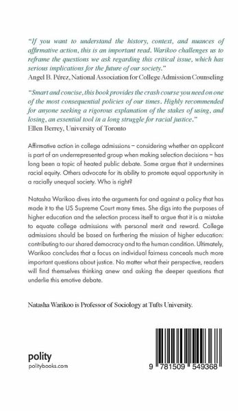 Natasha Warikoo dives into the arguments for and against a policy that has made it to the US Supreme Court many times. She digs into the purposes of higher education and the selection process itself to argue that it is a mistake to equate college admissions with personal merit and reward. College admissions should be based on furthering the mission of higher education: contributing to our shared democracy and to the human condition. Ultimately, Warikoo concludes that a focus on individual fairness conceals much more important questions about justice. No matter what their perspective, readers will find themselves thinking anew and asking the deeper questions that underlie this emotive debate.