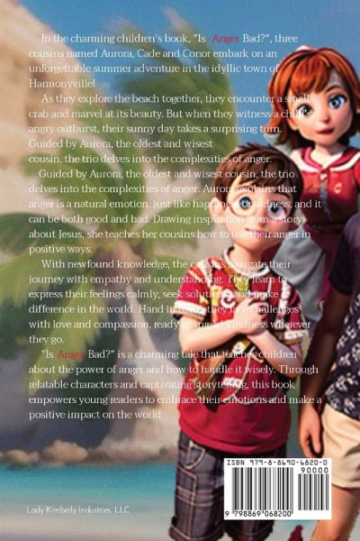In the charming children's book, "Is Anger Bad?", three cousins named Aurora, Cade, and Conor embark on an unforgettable summer adventure in the idyllic town of Harmonyville. As they explore the beach together, they encounter a small crab and marvel at its beauty. But when they witness a child's angry outburst, their sunny day takes a surprising turn. Guided by Aurora, the oldest and wisest cousin, the trio delves into the complexities of anger. Aurora explains that anger is a natural emotion, just like happiness or sadness, and it can be both good and bad. Drawing inspiration from a story about Jesus, she teaches her cousins how to use their anger in positive ways. With newfound knowledge, the cousins navigate their journey with empathy and understanding. They learn to express their feelings calmly, seek solutions, and make a difference in the world. Hand in hand, they face challenges with love and compassion, ready to spread kindness wherever they go. "Is Anger Bad?" is a charming tale that teaches children about the power of anger and how to handle it wisely. Through relatable characters and captivating storytelling, this book empowers young readers to embrace their emotions and make a positive impact on the world
