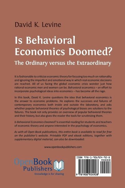 It is fashionable to criticize economic theory for focusing too much on rationality and ignoring the imperfect and emotional way in which real economic decisions are reached. All of us facing the global economic crisis wonder just how rational economic men and women can be. Behavioral economics - an effort to incorporate psychological ideas into economics - has become all the rage. In this book, David K. Levine questions the idea that behavioral economics is the answer to economic problems. He explores the successes and failures of contemporary economics both inside and outside the laboratory, and asks whether popular behavioral theories of psychological biases are solutions to the failures. The book not only provides an overview of popular behavioral theories and their history, but also gives the reader the tools for scrutinizing them. Is Behavioral Economics Doomed? is essential reading for students and teachers of economic theory and anyone interested in the psychology of economics.