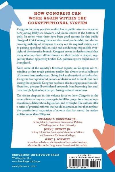 " Making Congress Work, Again, Within the Constitutional System Congress for many years has ranked low in public esteem-joining journalists, bankers, and union leaders at the bottom of polls. And in recent years there's been good reason for the public disregard, with the rise of hyper-partisanship and the increasing inability of Congress to carry out its required duties, such as passing spending bills on time and conducting responsible oversight of the executive branch. Congress seems so dysfunctional that many observers have all but thrown up their hands in despair, suggesting that an apparently broken U.S. political system might need to be replaced. Now, some of the country's foremost experts on Congress are reminding us that tough hyper-partisan conflict always has been a hallmark of the constitutional system. Going back to the nation's early decades, Congress has experienced periods of division and turmoil. But even in those periods Congress has been able to engage in serious deliberation, prevent ill-considered proposals from becoming law-and, over time, help develop a deeper, more lasting national consensus. The ten chapters in this volume focus on how Congress in the twenty-first century can once again fulfill its proper functions of representation, deliberation, legislation, and oversight. The authors offer a series of practical reforms that would maintain, rather than replace, the constitutional separation of powers that has served the nation well for more than 200 years."