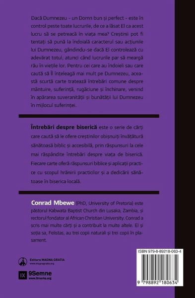 A Short Introduction to the Sovereignty of God for the Christian Life God's sovereignty is difficult for most people to wrap their minds around even when they're not going through difficult times; the topic raises many questions about salvation, evangelism, sin, and suffering. But when difficult circumstances arise, many believers ask, "Is God really in control?" In this addition to the Church Questions series, pastor Conrad Mbewe explains the Bible's teaching on God's sovereignty and addresses the common questions that it raises. He shows how it affects one's outlook on salvation, suffering, prayer, and worship in the Christian life. This short and accessible work is ideal for anyone currently struggling with the sovereignty of God or for new Christians wanting to learn more about God's sovereignty.