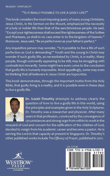 "Is it really possible to live a godly life?" This book considers the most imposing query of many young Christians. Jesus Christ, in His Sermon on the Mount, emphasized the necessity of a holy or nobler life than that of the sanctimonious people. He said, "Except your righteousness shall exceed the righteousness of the Scribes and Pharisees, ye shall in no case enter in to the kingdom of heaven." Moreover, Jesus said, "Be ye perfect even as your father is perfect." Any inquisitive person may wonder, "Is it possible to live a life of such perfection as God is demanding?" Youth and the young in Christ may wonder if such godly life, as necessitated by Christ, is a reality. Many people, though outwardly appearing to be still, may be struggling with contradiction inwardly. Some might have even come to the conclusion that godly life is humanly impossible. Most appallingly, some may even be thinking that all believers in Jesus Christ are hypocrites. This book demonstrates, through the important truths from the Holy Bible, that godly living is a reality, and it is possible even in these days to live a godly life.