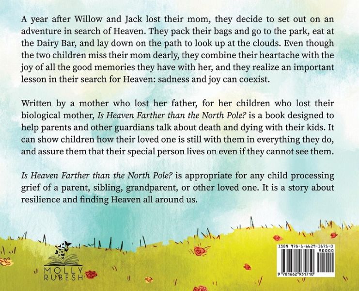 A year after Willow and Jack lost their mom, they decide to set out on an adventure in search of Heaven. They pack their bags and go to the park, eat at the Dairy Bar, and lay down on the path to look up at the clouds. Even though the two children miss their mom dearly, they combine their heartache with the joy of all the good memories they have with her, and they realize an important lesson in their search for Heaven: sadness and joy can coexist. Written by a mother who lost her father, for her children who lost their biological mother, Is Heaven Farther than the North Pole? is a book designed to help parents and other guardians talk about death and dying with their kids. It can show children how their loved one is still with them in everything they do, and assure them that their special person lives on even if they cannot see them. Is Heaven Farther than the North Pole? is appropriate for any child processing grief of a parent, sibling, grandparent, or other loved one. It is a story about resilience and finding Heaven all around us.