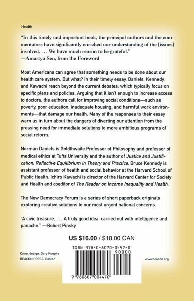 In this election year, health care again proves to be one of our nation's most urgent issues. Daniels, Kennedy, and Kawachi shift the focus of the debate, forcing us to take a closer look at how our health is affected by social injustice and inequality. Arguing that it isn't enough to increase access to doctors, they call for improving social conditions-such as poverty, lack of education and affordable housing, and harmful work environments-that damage our health. By urging us to work toward equality of opportunity for all, the authors situate health care reform among the larger social problems we must face. The authors' argument for reform in early childhood development, nutrition, work environment, and distribution of income is certain to spark debate. The editor of The New England Journal of Medicine and World Health Organization officials respond. The New Democracy Forum is a series of short paperback originals exploring creative solutions to our most urgent national concerns. "A civic treasure. . . . A truly good idea, carried out with intelligence and panache." --Robert Pinsky