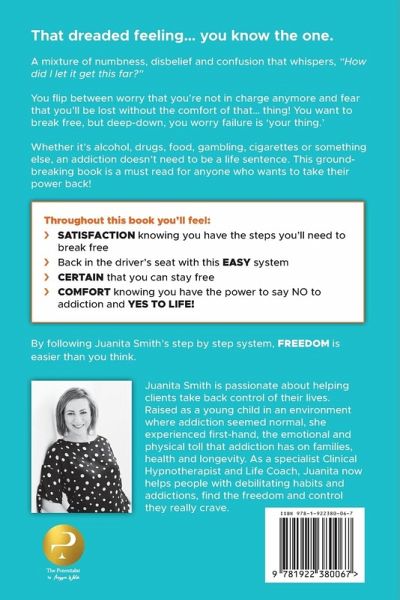 That dreaded feeling... you know the one... A mixture of numbness, disbelief and confusion that whispers, "How did I let it get this far?" You flip between worry that you're not in charge anymore and fear that you'll be lost without the comfort of that... thing! You want to break free, but deep-down, you worry failure is 'your thing.' Whether it's alcohol, drugs, food, gambling, cigarettes or something else, an addiction doesn't need to be a life sentence. This ground-breaking book is a must read for anyone who wants to take their power back! Throughout this book you'll feel: SATISFACTION knowing you have the steps you'll need to break free Back in the driver's seat with this EASY system CERTAIN that you can stay free COMFORT knowing you have the power to say NO to addiction and YES TO LIFE! By following Juanita Smith's step by step system, FREEDOM is easier than you think.