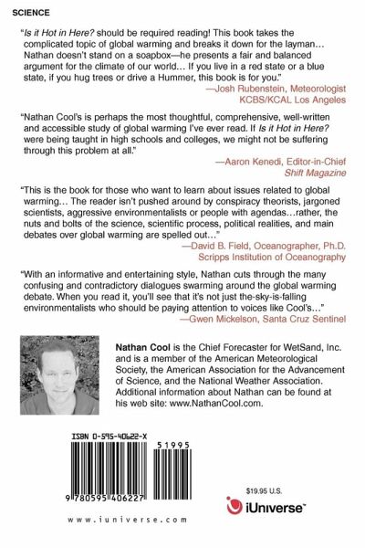 "Is it Hot in Here? should be required reading! This book takes the complicated topic of global warming and breaks it down for the layman. Nathan doesn't stand on a soapbox-he presents a fair and balanced argument for the climate of our world. If you live in a red state or a blue state, if you hug trees or drive a Hummer, this book is for you." -Josh Rubenstein, Meteorologist KCBS/KCAL Los Angeles "Nathan Cool's is perhaps the most thoughtful, comprehensive, well-written and accessible study of global warming I've ever read. If Is it Hot in Here? were being taught in high schools and colleges, we might not be suffering through this problem at all." -Aaron Kenedi, Editor-in-Chief Shift Magazine "This is the book for those who want to learn about issues related to global warming. The reader isn't pushed around by conspiracy theorists, jargoned scientists, aggressive environmentalists or people with agendas.rather, the nuts and bolts of the science, scientific process, political realities, and main debates over global warming are spelled out." -David B. Field, Oceanographer, Ph.D. Scripps Institution of Oceanography "With an informative and entertaining style, Nathan cuts through the many confusing and contradictory dialogues swarming around the global warming debate. When you read it, you'll see that it's not just the-sky-is-falling environmentalists who should be paying attention to voices like Cool's." -Gwen Mickelson, Santa Cruz Sentinel