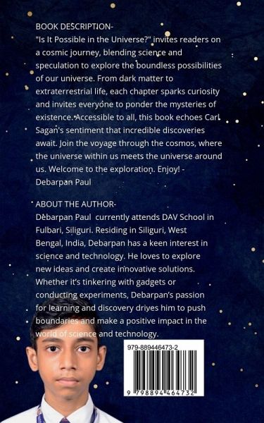 "Is It Possible in the Universe?" invites readers on a cosmic journey, blending science and speculation to explore the boundless possibilities of our universe. From dark matter to extraterrestrial life, each chapter sparks curiosity and invites everyone to ponder the mysteries of existence. Accessible to all, this book echoes Carl Sagan's sentiment that incredible discoveries await. Join the voyage through the cosmos, where the universe within us meets the universe around us. Welcome to the exploration. Enjoy! - Debarpan Paul