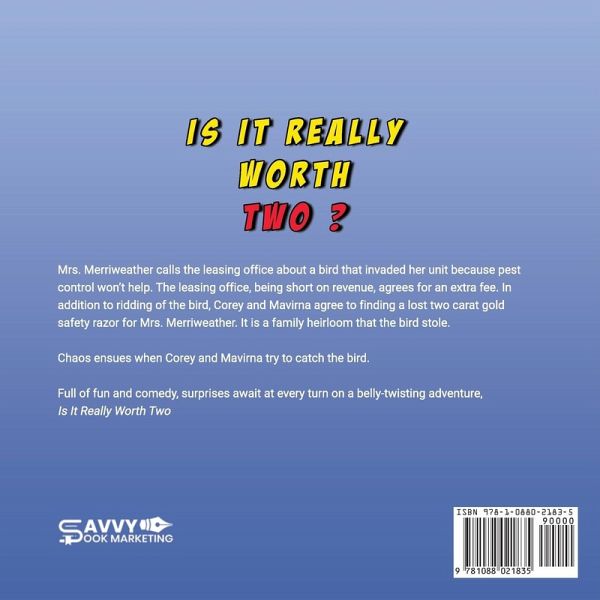 Mrs. Merriweather calls the leasing office about a bird that invaded her unit because pest control won't help. The leasing office, being short on revenue, agrees for an extra fee. In addition to ridding of the bird, Corey and Mavirna agree to finding a lost two carat gold safety razor for Mrs. Merriweather. It is a family heirloom that the bird stole. Chaos ensues when Corey and Mavirna try to catch the bird. Full of fun and comedy, surprises await at every turn on a belly-twisting adventure, Is It Really Worth Two