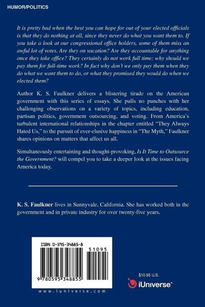 It is pretty bad when the best you can hope for out of your elected officials is that they do nothing at all since they never do what you want them to. If you take a look at our congressional office holders, some of them miss an awful lot of votes. Are they on vacation? Are they accountable for anything once they take office? They certainly do not work fulltime, why should we pay them for full time work? In fact why don't we only pay them when they do what we want them to do or what they promised they would do when we elected them? Author K. S. Faulkner delivers a blistering tirade on the American government with this series of essays. She pulls no punches with her challenging observations on a variety of topics, including education, partisan politics, government outsourcing, and voting. From America's turbulent international relationships in the chapter entitled 'They Always Hated Us," to the pursuit of ever-elusive happiness in 'The Myth," Faulkner shares opinions on matters that affect us all. Simultaneously entertaining and thought-provoking, Is It Time to Outsource the Government will compel you to take a deeper look at the issues facing America today.