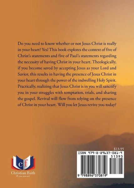 Do you need to know whether or not Jesus Christ is really in your heart? Yes! This book explores the context of five of Christ's statements and five of Paul's statements regarding the necessity of having Christ in your heart. Theologically, if you become saved by accepting Jesus as your Lord and Savior, this results in having the presence of Jesus Christ in your heart through the power of the indwelling Holy Spirit. Practically, realizing that Jesus Christ is in you will sanctify you in your struggles with temptation, trials, and sharing the gospel. Revival will flow from relying on the presence of Christ in your heart. Will you let Jesus revive you today?