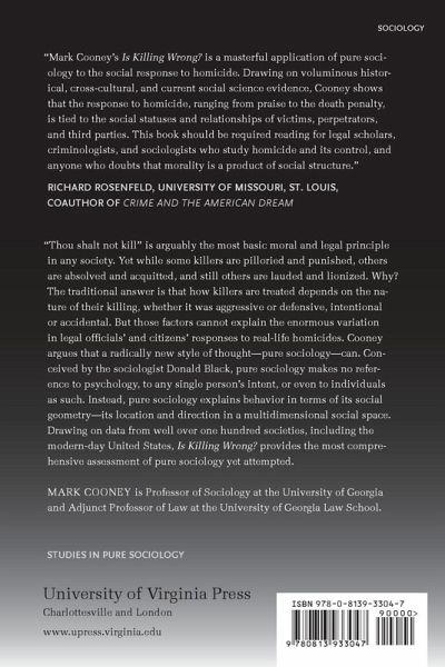 "Thou shalt not kill" is arguably the most basic moral and legal principle in any society. Yet while some killers are pilloried and punished, others are absolved and acquitted, and still others are lauded and lionized. Why? The traditional answer is that how killers are treated depends on the nature of their killing, whether it was aggressive or defensive, intentional or accidental. But those factors cannot explain the enormous variation in legal officials' and citizens' responses to real-life homicides. Cooney argues that a radically new style of thought--pure sociology--can. Conceived by the sociologist Donald Black, pure sociology makes no reference to psychology, to any single person's intent, or even to individuals as such. Instead, pure sociology explains behavior in terms of its social geometry--its location and direction in a multidimensional social space. Is Killing Wrong? provides the most comprehensive assessment of pure sociology yet attempted. Drawing on data from well over one hundred societies, including the modern-day United States, it represents the most thorough account yet of case-level social control, or the response to conduct defined as wrong. In doing so, it demonstrates that the law and morality of homicide are neither universal nor relative but geometrical, as predicted by Black's theory.