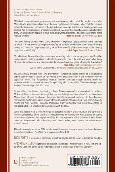 Dedication Contents Editor's Note Acknowledgements Abbreviations 1. A Sad Story: An Introduction to and Commentary on the Debate, Nick Potts Part I. The Simultaneist-Temporalist Debate 2. Simultaneous Valuation vs. the Exploitation Theory of Profit, Andrew Kliman 3. On the TSSI and the Exploitation Theory of Profit, Simon Mohun 4. Deriving a Negative PNP, Andrew Kliman 5. Exploitation, Profits and Time, Roberto Veneziani 6. Replicating Marx: A Reply to Mohun, Andrew Kliman and Alan Freeman 7. The Incoherence of the TSSI: A reply to Kliman and Freeman, Simon Mohun and Roberto Veneziani 8. Simultaneous Valuation vs. the Exploitation Theory of Profit: A Summing Up, Alan Freeman and Andrew Kliman 9. The Truthiness of Veneziani's Critique of Marx and the TSSI, Andrew Kliman and Alan Freeman 10. The Temporal Single-System Interpretation: Underdetermination and Inconsistency, Simon Mohun and Roberto Veneziani 11. No Longer a Question of Truth?: The Knell of Scientific Bourgeois Marxian Economics an