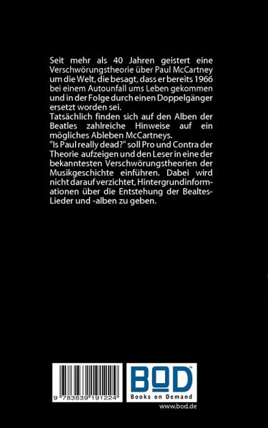 Seit mehr als 40 Jahren geistert eine Verschwörungstheorie über Paul McCartney um die Welt, die besagt, dass er bereits 1966 bei einem Autounfall ums Leben gekommen und in der Folge durch einen Doppelgänger ersetzt worden sei.Tatsächlich finden sich auf den Alben der Beatles zahlreiche Hinweise auf ein mögliches Ableben McCartneys."Is Paul really dead?" soll Pro und Contra der Theorie aufzeigen und den Leser in eine der bekanntesten Verschwörungstheorien der Musikgeschichte einführen. Dabei wird nicht darauf verzichtet, Hintergrundinformationen über die Entstehung der Bealtes-Lieder und -alben zu geben.