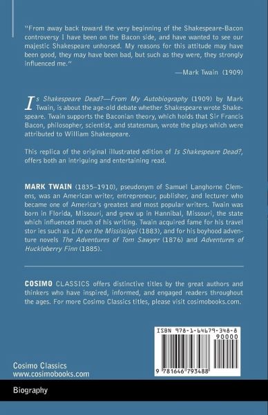 "From away back toward the very beginning of the Shakespeare-Bacon controversy I have been on the Bacon side, and have wanted to see our majestic Shakespeare unhorsed. My reasons for this attitude may have been good, they may have been bad, but such as they were, they strongly influenced me." -Mark Twain (1909) Is Shakespeare Dead?-From My Autobiography (1909), by Mark Twain, is about the age-old debate whether Shakespeare wrote Shakespeare. Twain supports the Baconian theory, which holds that Sir Francis Bacon, philosopher, scientist, and statesman, wrote the plays which were attributed to William Shakespeare. This replica of the original illustrated edition of Is Shakespeare Dead?, offers both an intriguing and entertaining read.