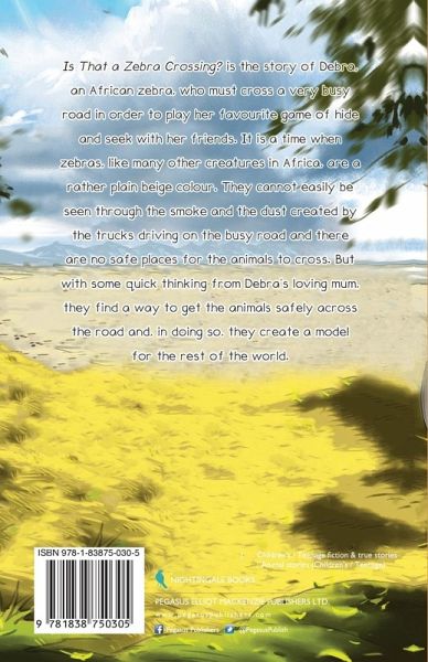 Is That a Zebra Crossing? is the story of Debra, an African zebra, who must cross a very busy road in order to play her favourite game of hide and seek with her friends. It is a time when zebras, like many other creatures in Africa, are a rather plain beige colour. They cannot easily be seen through the smoke and the dust created by the trucks driving on the busy road and there are no safe places for the animals to cross. But with some quick thinking from Debra's loving mum, they find a way to get the animals safely across the road and, in doing so, they create a model for the rest of the world.