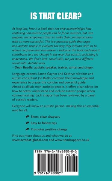 Whether we're aware of it or not, we will all know an autistic person, which makes this exciting new book an essential read for all. Language experts Zanne Gaynor and Kathryn Alevizos and autism consultant Joe Butler, combine their knowledge and experience in this unique and accessible guide to more inclusive communication in a neurodiverse world. Every autistic person experiences differences in communication. A lack of recognition of this can lead to miscommunication and heightened anxiety for many autistic people. Is That Clear? recognises and addresses this by offering practical tips, which have all been reviewed and endorsed by autistic readers. Condensed into bite-sized chapters, the book covers key areas from instructions and questions to figurative speech, the pitfalls of small talk and phone calls - and much more. A highly recommended read that sensitively promotes inclusion and diversity.