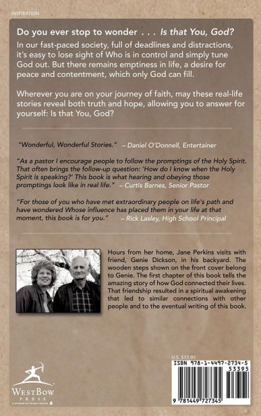 Do you ever stop to wonder...Is that You, God? In our fast-paced society, full of deadlines and distractions, it¿s easy to lose sight of Who is in control and simply tune God out. But there remains emptiness in life, a desire for peace and contentment, which only God can fill. Wherever you are on your journey of faith, may these real-life stories reveal both truth and hope, allowing you to answer for yourself: Is that You, God?