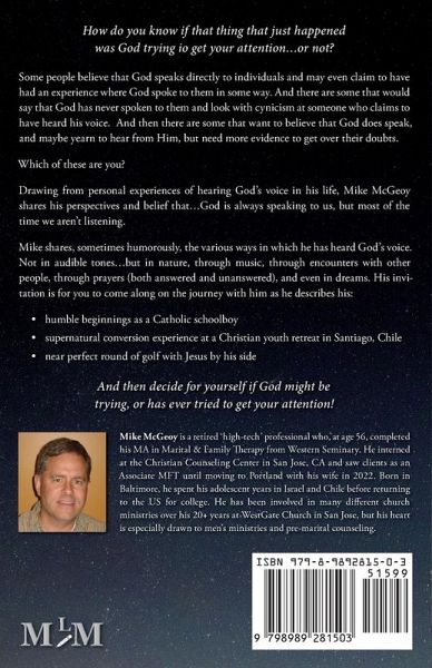 How do you know if that thing that just happened was God trying io get your attention...or not? Some people believe that God speaks directly to individuals and may even claim to have had an experience where God spoke to them in some way. And there are some that would say that God has never spoken to them and look with cynicism at someone who claims to have heard his voice. And then there are some that want to believe that God does speak, and maybe yearn to hear from Him, but need more evidence to get over their doubts. Which of these are you? Drawing from personal experiences of hearing God's voice in his life, Mike McGeoy shares his perspectives and belief that...God is always speaking to us, but most of the time we aren't listening. Mike shares, sometimes humorously, the various ways in which he has heard God's voice. Not in audible tones...but in nature, through music, through encounters with other people, through prayers (both answered and unanswered), and even in dreams. His invitation is for you to come along on the journey with him as he describes his: humble beginnings as a Catholic schoolboy supernatural conversion experience at a Christian youth retreat in Santiago, Chile near perfect round of golf with Jesus by his side And then decide for yourself if God might be trying, or has ever tried, to get your attention!