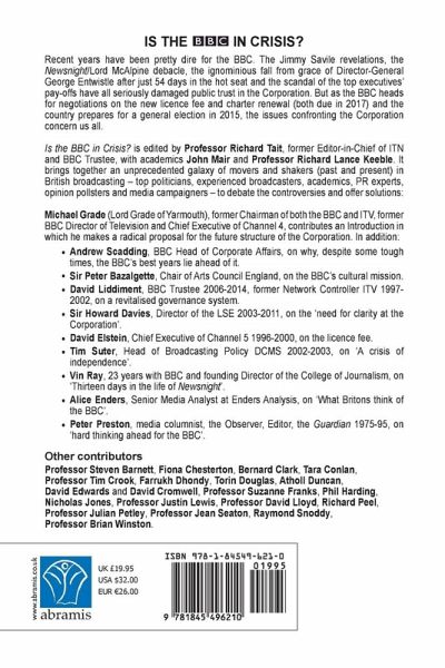 Recent years have been pretty dire for the BBC. The Jimmy Savile revelations, the Newsnight/Lord McAlpine debacle, the ignominious fall from grace of Director-General George Entwistle after just 54 days in the hot seat and the scandal of the top executives' pay-offs have all seriously damaged public trust in the Corporation. But as the BBC heads for negotiations on the new licence fee and charter renewal (both due in 2017) and the country prepares for a general election in 2015, the issues confronting the Corporation concern us all. Is the BBC in Crisis? is edited by Professor Richard Tait, former Editor-in-Chief of ITN and BBC Trustee, with academics John Mair and Professor Richard Lance Keeble. It brings together an unprecedented galaxy of movers and shakers (past and present) in British broadcasting - top politicians, experienced broadcasters, academics, PR experts, opinion pollsters and media campaigners - to debate the controversies and offer solutions: Michael Grade (Lord Grade of Yarmouth), former Chairman of both the BBC and ITV, former BBC Director of Television and Chief Executive of Channel 4, contributes an Introduction in which he makes a radical proposal for the future structure of the Corporation. In addition: ¿ Andrew Scadding, BBC Head of Corporate Affairs, on why, despite some tough times, the BBC's best years lie ahead of it. ¿ Sir Peter Bazalgette, Chair of Arts Council England, on the BBC's cultural mission. ¿ David Liddiment, BBC Trustee 2006-2014, former Network Controller ITV 1997-2002, on a revitalised governance system. ¿ Sir Howard Davies, Director of the LSE 2003-2011, on the 'need for clarity at the Corporation'. ¿ David Elstein, Chief Executive of Channel 5 1996-2000, on the licence fee. ¿ Tim Suter, Head of Broadcasting Policy DCMS 2002-2003, on 'A crisis of independence'. ¿ Vin Ray, 23 years with BBC and founding Director of the College of Journalism, on 'Thirteen days in the life of Newsnight'. ¿ Alice Enders, Senior Media Analyst at Enders Analysis, on 'What Britons think of the BBC'. ¿ Peter Preston, media columnist, the Observer, Editor, the Guardian 1975-95, on 'hard thinking ahead for the BBC'. Other contributors Professor Steven Barnett, Fiona Chesterton, Bernard Clark, Tara Conlan, Professor Tim Crook, Farrukh Dhondy, Torin Douglas, Atholl Duncan, David Edwards and David Cromwell, Professor Suzanne Franks, Phil Harding, Nicholas Jones, Professor Justin Lewis, Professor David Lloyd, Richard Peel, Professor Julian Petley, Professor Jean Seaton, Raymond Snoddy, Professor Brian Winston.