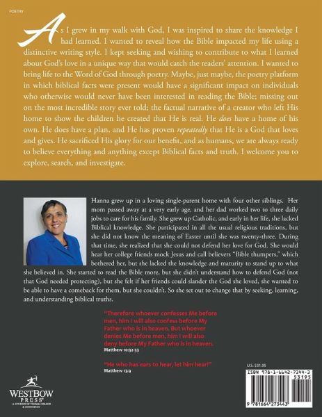 As I grew in my walk with God, I was inspired to share the knowledge I had learned. I wanted to reveal how the Bible impacted my life using a distinctive writing style. I kept seeking and wishing to contribute to what I learned about God's love in a unique way that would catch the readers' attention. I wanted to bring life to the Word of God through poetry. Maybe, just maybe, the poetry platform in which biblical facts were present would have a significant impact on individuals who otherwise would never have been interested in reading the Bible; missing out on the most incredible story ever told; the factual narrative of a creator who left His home to show the children he created that He is real. He does have a home of his own. He does have a plan, and He has proven repeatedly that He is a God that loves and gives. He sacrificed His glory for our benefit, and as humans, we are always ready to believe everything and anything except Biblical facts and truth. I welcome you to explore, search, and investigate.