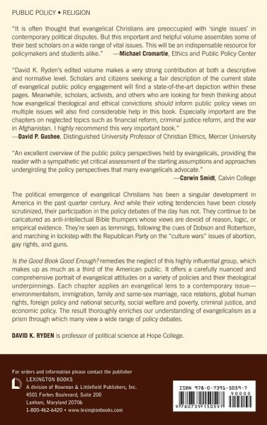 The book analyzes evangelical Christianity as a comprehensive perspective for understanding the range of contemporary policy issues in America. It finds that evangelicalism can be understood as a distinctive approach to understanding policy debates, that evangelicals are not as monolithic as commonly thought, but that their policy activism is still marred by significant shortcomings, namely their failure to employ non-biblical arguments and rhetoric that might resonate with non-evangelical Christians.