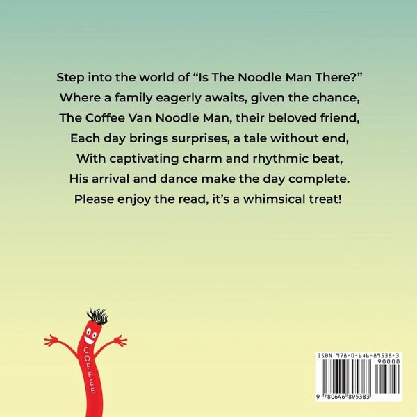 Embark on a delightful journey with your little ones in "Is the Noodle Man There?" - a charming children's book filled with whimsy, anticipation, and the joy of a special friend. Join the eager family as they set out on their daily school routine, with one question on their minds: Will the Coffee Van Noodle Man be there today? From Monday to Friday, the children eagerly await the presence of their favorite Noodle Man, a cheerful and colorful figure dancing in the wind, beckoning them with the promise of a special treat. As the week unfolds, discover the whimsical reasons why the Noodle Man might be missing. Whether it's the weather, an early morning need for beauty sleep, or a playful pun from Dad, each day brings a new surprise and an opportunity for the children to giggle, wonder, and share in the excitement of the Noodle Man's anticipated arrival. But when he finally shows up, it's not just a wave or a greeting - it's time for the Noodle Man Dance! Readers young and old will delight in the playful and infectious rhythm of this unique dance, making every appearance of the Noodle Man a celebration to remember. With its rhythmic prose, engaging storyline, and vibrant illustrations, "It's the Noodle Man Dance" is the perfect companion for children aged 2-6. This heartwarming tale encourages a love for rhythm, a sense of wonder, and the joy of shared moments with family. Add a dash of noodle-inspired fun to your storytime routine with this whimsical children's book. "Is the Noodle Man There?" is not just a story; it's a delightful dance waiting to be shared and enjoyed.