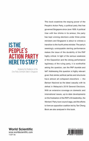 This book examines the staying power of the People's Action Party, a political party that has governed Singapore since June 1959. A political titan with few chinks in its armour, the party has kept winning elections under three prime ministers and Singapore is about to witness a transition to the fourth prime minister. The party's seemingly unstoppable sterling performance makes the issue of the durability of the PAP highly critical. In light of the serious weakness of the Opposition and the strong performance legitimacy of the ruling party, it is worthwhile asking the question, can the PAP stumble and fall? Addressing this question is highly relevant given that similar political parties and structures have almost all collapsed elsewhere — the Barisan Nasional as the latest casualty with its defeat in Malaysia's 2018 General Elections. With an extensive coverage on domestic and international issues, up-to-date developments on the finalisation of the PAP's 4G leadership, the Workers' Party town council saga, and the efforts to form an opposition coalition led by Tan Cheng Bock are also analysed in this book.