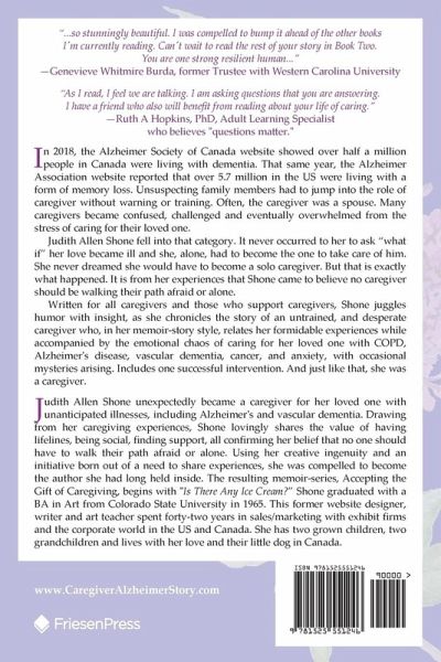 In 2018, the Alzheimer Society of Canada website showed over half a million people in Canada were living with dementia. That same year, the Alzheimer Association website reported that over 5.7 million in the US were living with a form of memory loss. Unsuspecting family members had to jump into the role of caregiver without warning or training. Often, the caregiver was a spouse. Many caregivers became confused, challenged and eventually overwhelmed from the stress of caring for their loved one. Judith Allen Shone fell into that category. It never occurred to her to ask "what if" her love became ill and she, alone, had to become the one to take care of him. She never dreamed she would have to become a solo caregiver. But that is exactly what happened. It is from her experiences that Shone came to believe no caregiver should be walking their path afraid or all alone. Written for all caregivers and those who support caregivers, Shone juggles humor with insight, as she chronicles the story of an untrained and desperate caregiver who, in her memoir-story style, relates her formidable experiences accompanied by the emotional chaos of caregiving for her loved one with COPD, Alzheimer's disease, vascular dementia, cancer, and anxiety, with occasional mysteries arising. Includes one successful intervention.