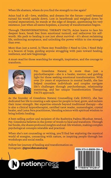 When life shatters, where do you find the strength to rise again? Arjun had it all-love, stability, and dreams for the future-until betrayal turned his world upside down. Lost in heartbreak and weighed down by societal expectations, he stands at the edge of despair, questioning his very existence. Just when all seems hopeless, a journey of transformation begins. Through TRANSFORMATIONAL THERAPY FACTS, Arjun learns to face his deepest fears, break free from emotional turmoil, and rediscover his self-worth. His path to healing is not just about survival-it's about reclaiming life, embracing acceptance, and unlocking the power within to rise stronger than ever. More than just a novel, Is There Any Possibility - I Need to Live, I Need Help is a beacon of hope, guiding anyone struggling with pain toward healing, resilience, and new beginnings. A must-read for those searching for strength, inspiration, and the courage to transform.