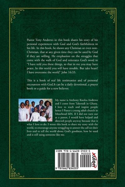 Pastor Tony Andrews in this book shares his story of his personal experiences with God and God's faithfulness in his life. In this book, he shows any Christian or even non-Christian, that at any given time they can be used by God if they are willing. He emphasizes on the struggles that come with the walk of God and reiterates God's word in "I have told you these things, so that in me you may have peace. In this world you will have trouble. But take heart! I have overcome the world" John 16:33. This is a book of real life testimonies and of personal encounters with God.It can be a daily devotional, a prayer book or a guide for a new believer. My name is Anthony Kweku Andrews and I come from Takoradi in Ghana. I love to teach and inspire people hence I Pastor a young adult church in Moorhead MN. If I did not turn out as a pastor, I would have helped and directed people anyway because that is what I love to do. I wrote this book to share my story with the world, to encourage anyone struggling to answer the call on their lives and to tell the world about God's goodness, how he used and is still using someone like me.