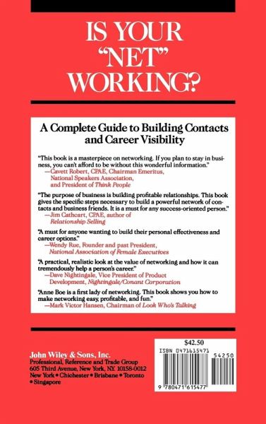 Is Your "Net" Working? A Complete Guide to Building Contacts and Career Visibility "This book is a masterpiece on networking. If you plan to stay in business, you can't afford to be without this wonderful information." --Cavett Robert, CPAE, Chairman Emeritus, National Speakers Association, and President of Think People "The purpose of business is building profitable relationships. This book gives the specific steps necessary to build a powerful network of contacts and business friends. It is a must for any success-oriented person." --Jim Cathcart, CPAE, author of Relationship Selling "A must for anyone wanting to build their personal effectiveness and career options." --Wendy Rue, Founder and past President, National Association of Female Executives "A practical, realistic look at the value of networking and how it can tremendously help a person's career." --Dave Nightingale, Vice President of Product Development, Nightingale/Conant Corporation "Anne Boe is a first lady of networking. This book shows you how to make networking easy, profitable, and fun." --Mark Victor Hansen, Chairman of Look Who's Talking