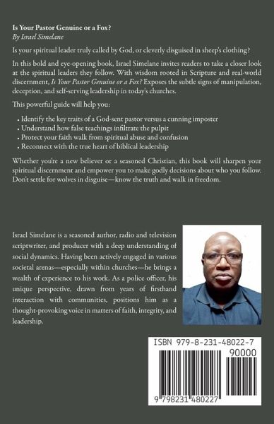 Is Your Pastor Genuine or a Fox? By Israel Simelane Is your spiritual leader truly called by God-or cleverly disguised in sheep's clothing? In this bold and eye-opening book, Israel Simelane invites readers to take a closer look at the spiritual leaders they follow. With wisdom rooted in Scripture and real-world discernment, Is Your Pastor Genuine or a Fox? exposes the subtle signs of manipulation, deception, and self-serving leadership in today's churches. This powerful guide will help you:Identify the key traits of a God-sent pastor versus a cunning imposter Understand how false teachings infiltrate the pulpit Protect your faith walk from spiritual abuse and confusion Reconnect with the true heart of biblical leadership Whether you're a new believer or a seasoned Christian, this book will sharpen your spiritual discernment and empower you to make godly decisions about who you follow. Don't settle for wolves in disguise-know the truth and walk in freedom.