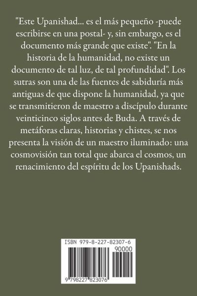 "Este Upanishad... es el más pequeño -puede escribirse en una postal- y, sin embargo, es el documento más grande que existe". "En la historia de la humanidad, no existe un documento de tal luz, de tal profundidad". Los sutras son una de las fuentes de sabiduría más antiguas de que dispone la humanidad, ya que se transmitieron de maestro a discípulo durante veinticinco siglos antes de Buda. A través de metáforas claras, historias y chistes, se nos presenta la visión de un maestro iluminado: una cosmovisión tan total que abarca el cosmos, un renacimiento del espíritu de los Upanishads.