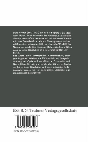Newton und seine Zeit.- Kindheit. Jugend. Schulbildung.- Universitätsstudium in Cambridge. Professur.- Frühe optische Studien. Spiegelteleskop.- Die Royal Society.- Optische Studien. Farbenlehre.- Mathematische Entdeckungen.- Gravitation.- Principia.- Chemische Studien.- Naturphilosophie.- Newton in Cambridge.- Newton in London. Lebensende.- Ausklang. Nachwirkung.- Chronologie.- Literatur.- Personenregister.