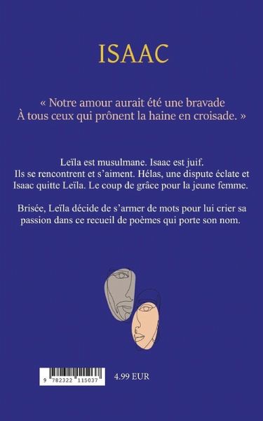Leïla est musulmane. Isaac est juif. Ils se rencontrent et s'aiment. Hélas une dispute éclate et Isaac quitte Leïla.Le coup de grâce pour la jeune femme. Brisée, Leïla décide de s'armer de mots pour lui crier sa passion dans ce recueil de poèmes qui porte son nom.