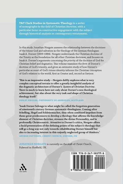 Norgate assesses the way in which the Christian doctrine of the Trinity is the foundation for all other Christian doctrines, especially the Christian understanding of salvation. He investigates in detail the approach of the German Lutheran theologian, Isaac A. Dorner (1809-1884) to this question. Analysis of his arguments concerning the priority of the doctrine of God for Christian belief and dogmatics is given. It examines the form of his doctrine of God's triunity, and gives an extensive study of how Dorner's particular account of God's triune identity informs the Christian conception of God's relation to the world, first, as Creator and, second, as Saviour. In this process, it seeks to refocus attention on Dorner as a major figure in the development of modern theology. The relationship between Dorner's doctrines of the triune God and salvation is assesed. Dorner's positive reconstruction of the Christian idea of God as Trinity provides helpful resources in delineating a non-competitive account of God's relation to the world. This means that God is not confused with nor distant from the world. The eternal vitality of God's immanent personality is the basis of His vital economic activity, which culminates in the incarnation of the Son. We follow the main tributories of Dorner's arguments in System of Christian Faith, beginning with an analysis of his doctrine of God, via his development of the doctrines of creation, humanity, and the incarnation of the God-man. An assessment is given of those doctrines which pertain to the way in which God brings salvation through Jesus Christ: sin, Jesus, and atonement. Norgate concludes by comparing Dorner's achievements with those found in more recent theologies of atonement.